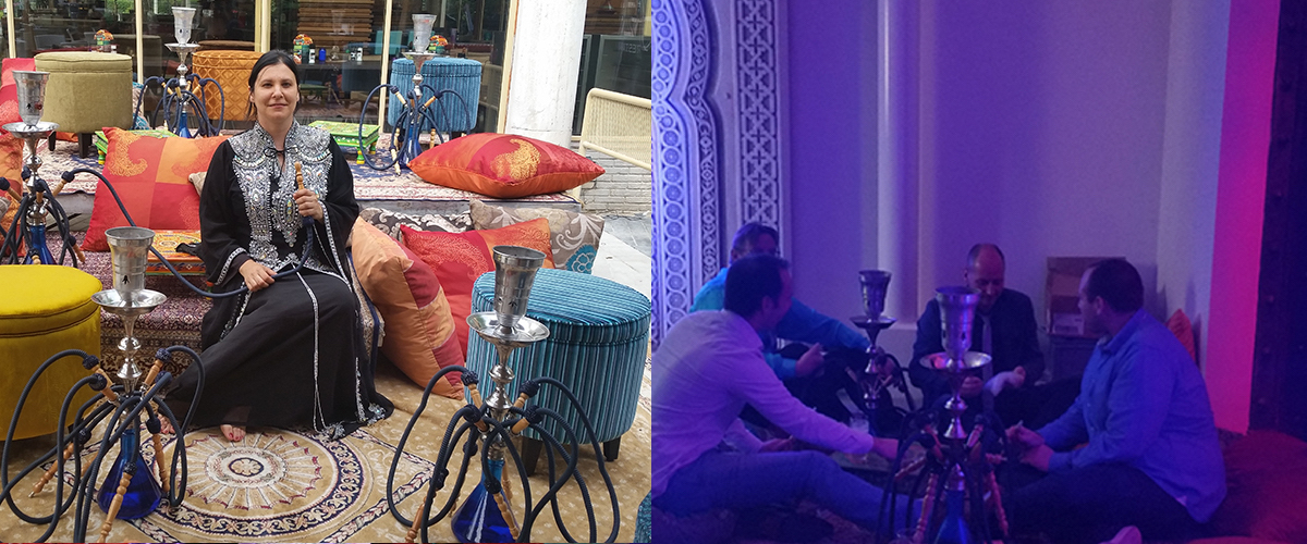 Wij kunnen het waterpijpterras verzorgen in blauwe of aardse kleuren. Begeleider in het zwart of in Arabische kleding.